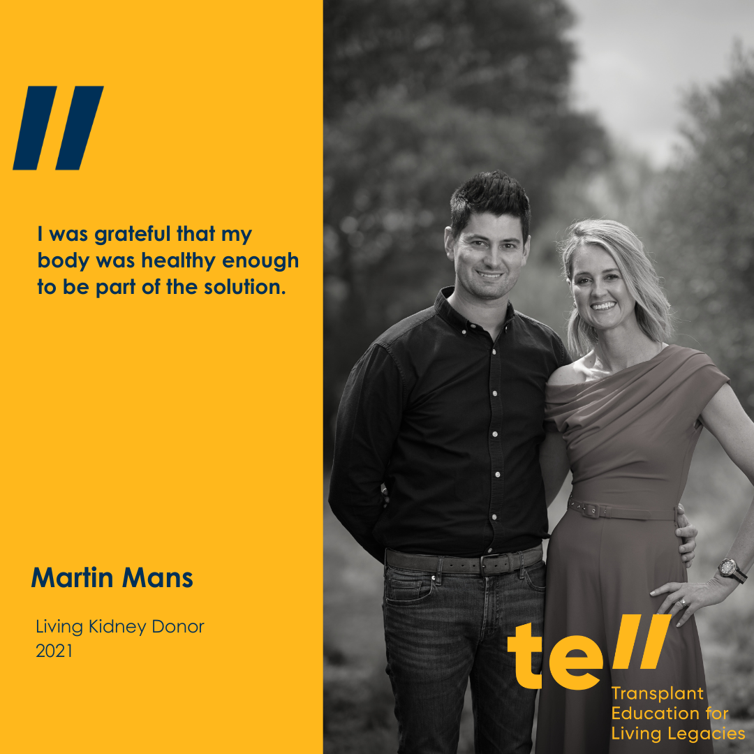 In 2021, Martin Mans (37) from Stellenbosch made the life-changing decision to donate a kidney to his sister, Mariëtte Botha. She was able to obtain her PhD due to the generous lifesaving gift.