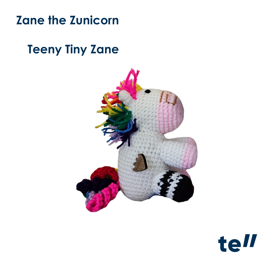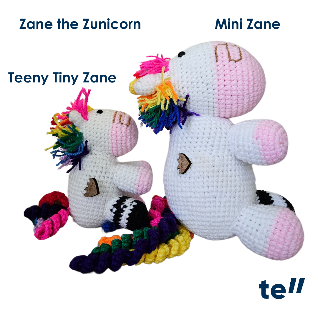 Teeny Tiny Zane, at 13 cm tall, is specially designed for babies, with soft crochet eyes for added safety, making him the perfect first companion with a powerful message.